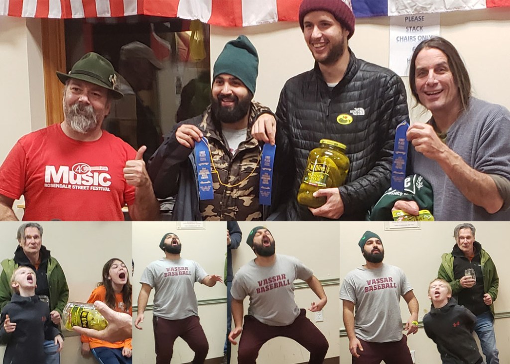 | PICKLE EATING 1st: Akasha Finkle, New Paltz, NY 2nd: Edward Pomerantz, Newburgh, NY 3rd: Josh Bendell, Kerhonkson, NY) KIDS DIVISION; 1st: Dana M, Ballston Spa, NY 2nd: Amber S, Middletown, NY 3rd: Chaise H, Kingston, NY | PICKLE JUICE DRINKING 1st: Lorianna Fernandez, Staten Island, NY 2nd: Meredith Hurley, Wappingers Falls, NY 3rd: Ray Mathers, Long Island, NY KIDS DIVISION 1st: Dana B, Spa, NY 2nd: Isla J, Poughkeepsie, NY 3rd: Chaise H, Kingston, NY | PICKLE TOSSING 1st: Josh Bendell, Kerhonkson, NY David Misner, Livingston Manor, NY Vickie Misner, Livingston Manor, NY 2nd: Sean Nickoson, Patterson, NY Meredith Hurley, Wappingers Falls, NY Kevin Starkey, Big Flats, NY 3rd: James, NJ Joseph, NJ Amy, NJ |